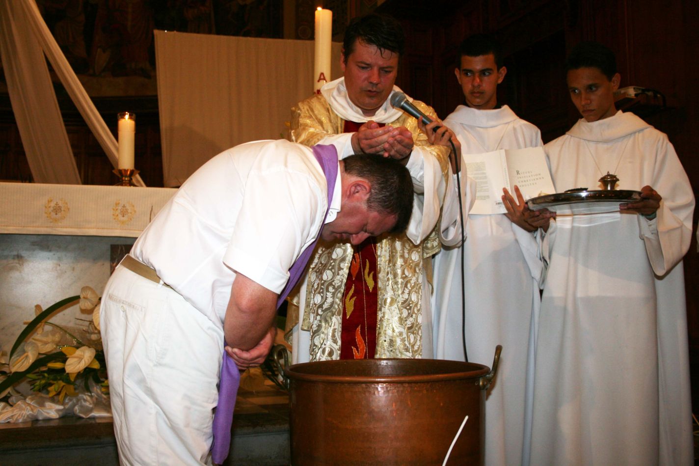 Les baptêmes d'adultes sont célébrés dans la nuit de Pâques lors de la Vigile Pascale. Les sacrements de la confirmation et de la communion eucharistique sont traditionnelement aussitôt administrés après le baptême.