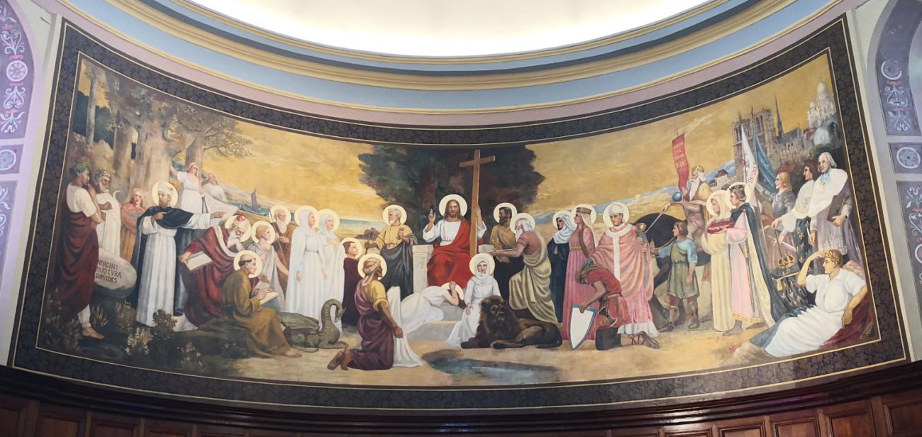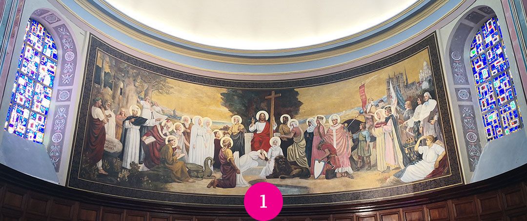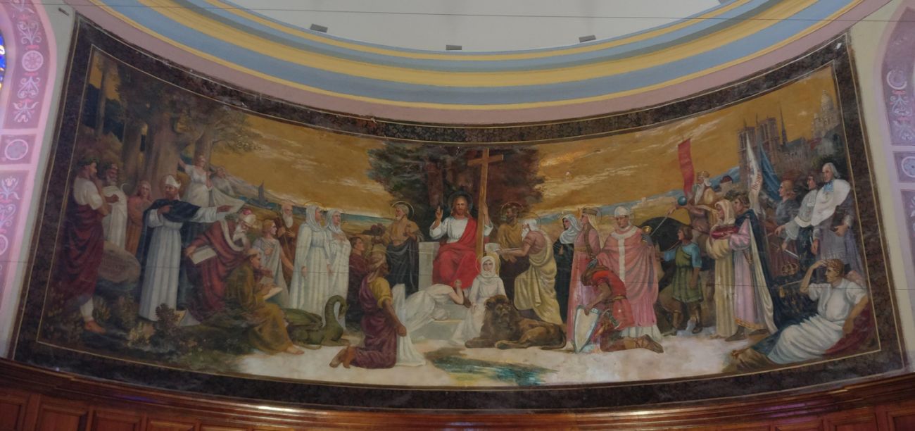 Toile marouflée de l'histoire du Christianisme en France. Réalisée par l'Abbé Moirod et placée en 1905. Les vitraux ont été réalisés par le Maître-Verrier Henri Martin-Granel en 1956