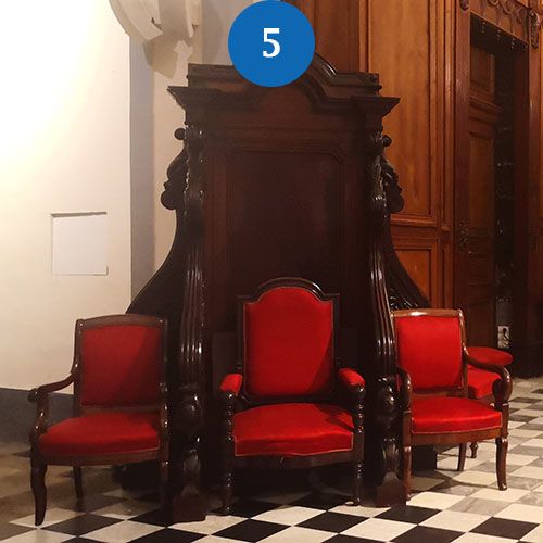 La cathèdre. Le trône de l'évêque. Œuvre de Madrolle datant de 1861 en bois de teck de même que les stalles du chœur.