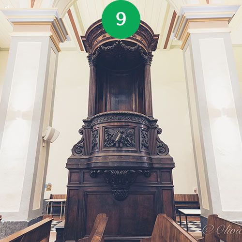 La chaire. Magnifiquement sculptée en bois de teck d’Inde, a été réalisée par l’artisan-menuisier Camus aidé par des ouvriers indiens d’après les plans de Madrolle, ébéniste et réalisateur de toutes les boiseries du chœur.
