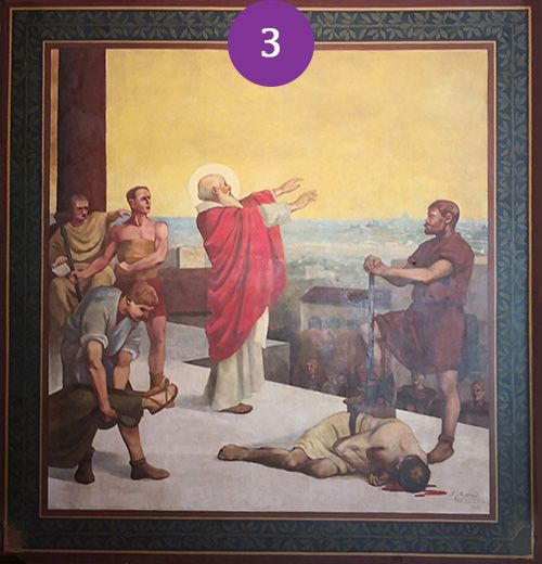 Toile marouflée réalisée par l'Abbé Moirod - Saint Denis bénissant la ville de Paris au jour de son martyr. Son disciple Eleuthère gît déjà à terre occis par le bourreau