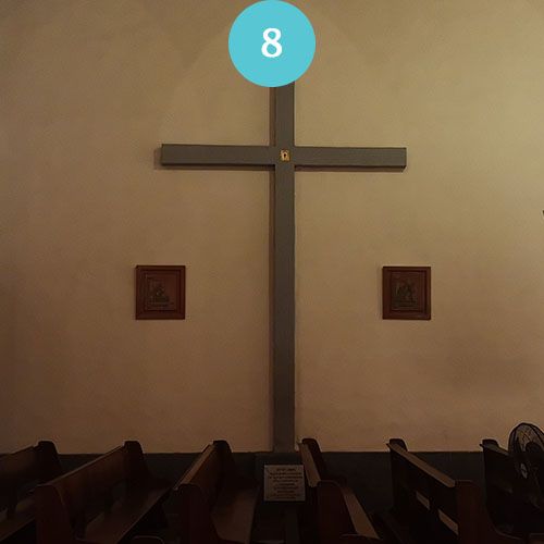 Relique de la vraie Croix. Le reliquaire est formé de deux parties de l'ancienne charpente détruite par le cyclone Jenny. Elle a été érigée le vendredi saint 1963. La relique se situe au croisement des deux bras.